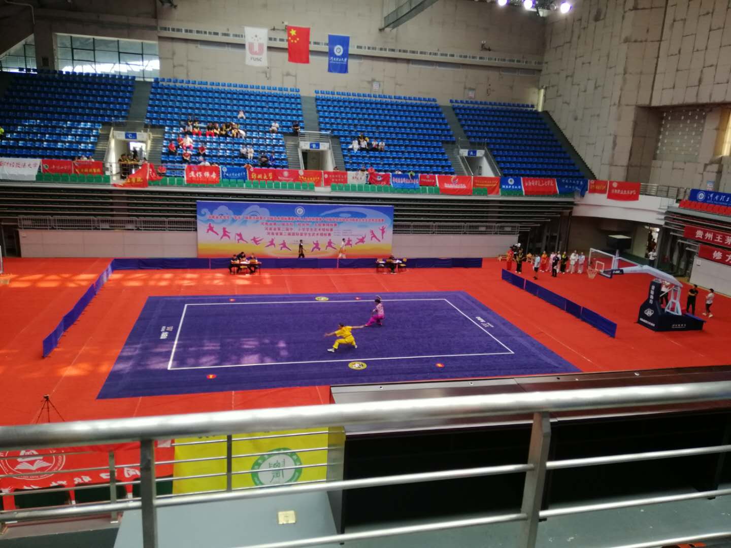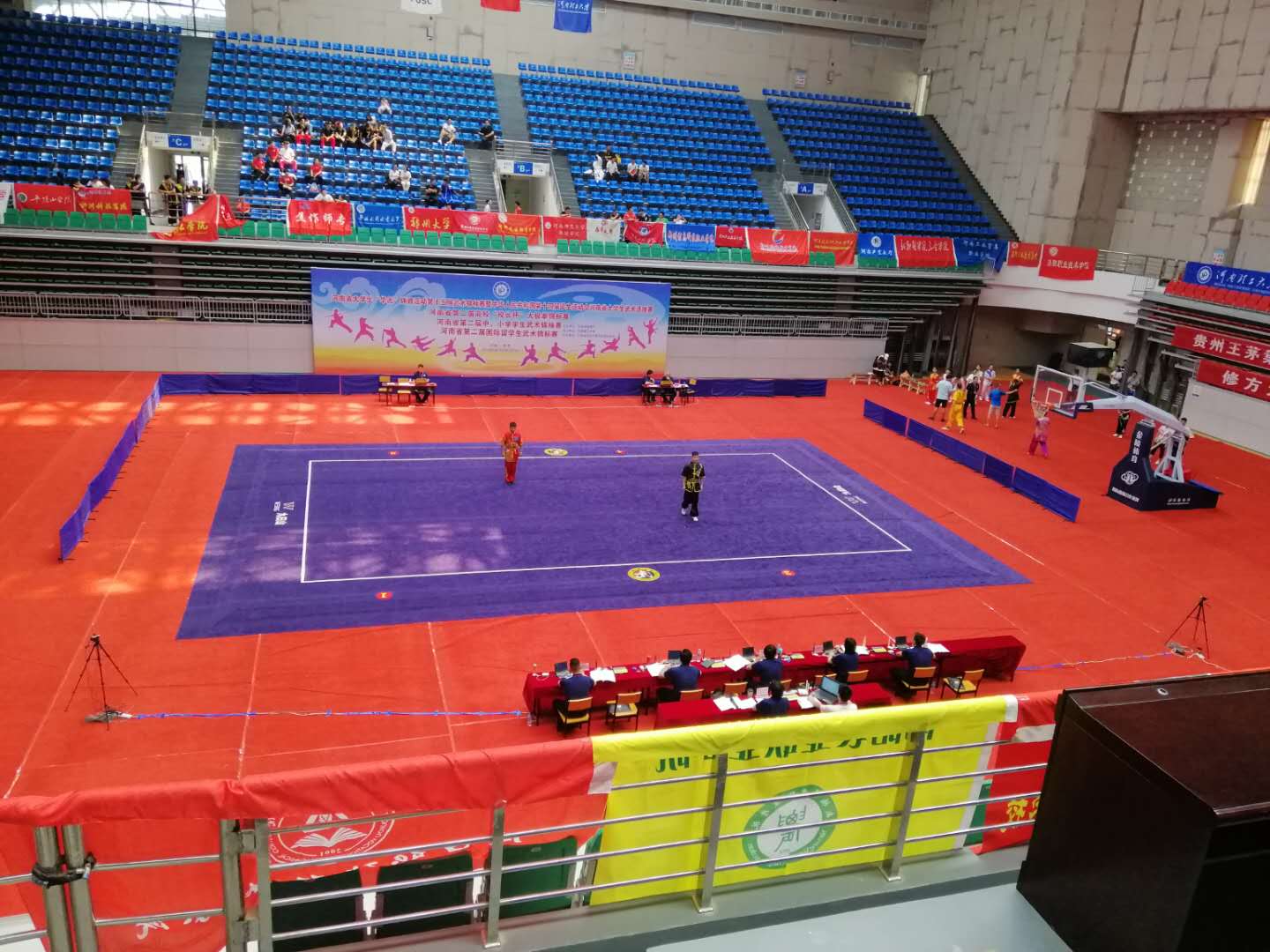 6月25--29日在河南理工大学举行的河南省大学生第十五届武术锦标赛上我校武术队员在比赛中努力拼搏,不畏强手。