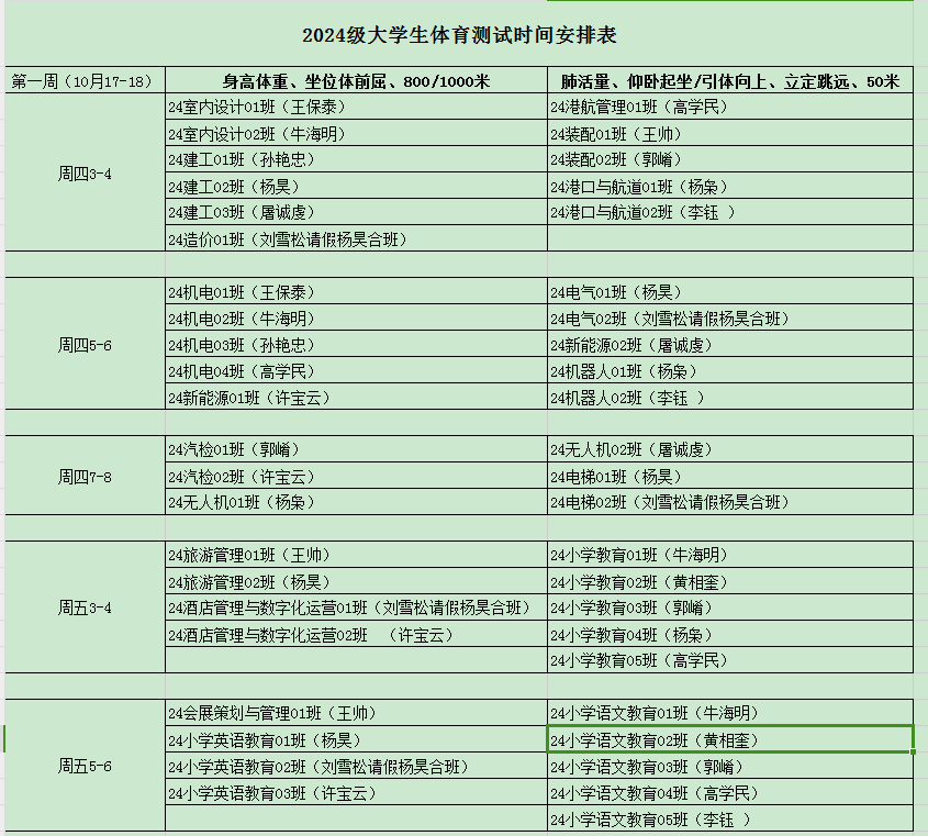 2024级大学生体育测试时间安排表